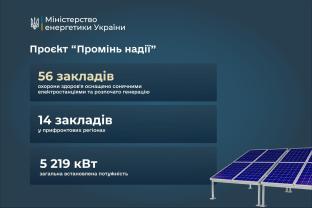 Від запуску проєкту «Промінь надії» вже встановлені та генерують електроенергію сонячні електростанції у 56 закладах охорони здоров'я, 14 з них - у прифронтових регіонах. Загальна потужність встановленого обладнання - 5 219 кВт.