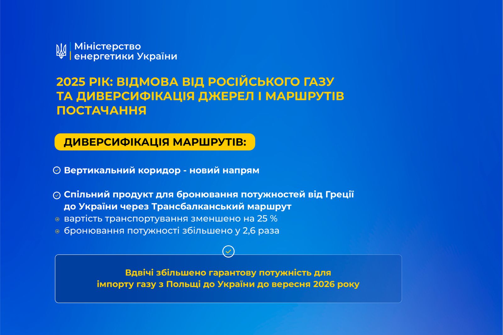 Оператори газотранспортних систем Польщі та України вдвічі збільшили гарантовану пропускну потужність до вересня 2026 року. Польський маршрут імпорту газу поступово посилюється і є важливим для забезпечення імпорту природного газу в Україну. Це також доступ до нових джерел ресурсу. Наприклад, LNG термінали у Польщі та Литві, що суттєво розширює джерела постачання і підвищує енергетичну безпеку України.