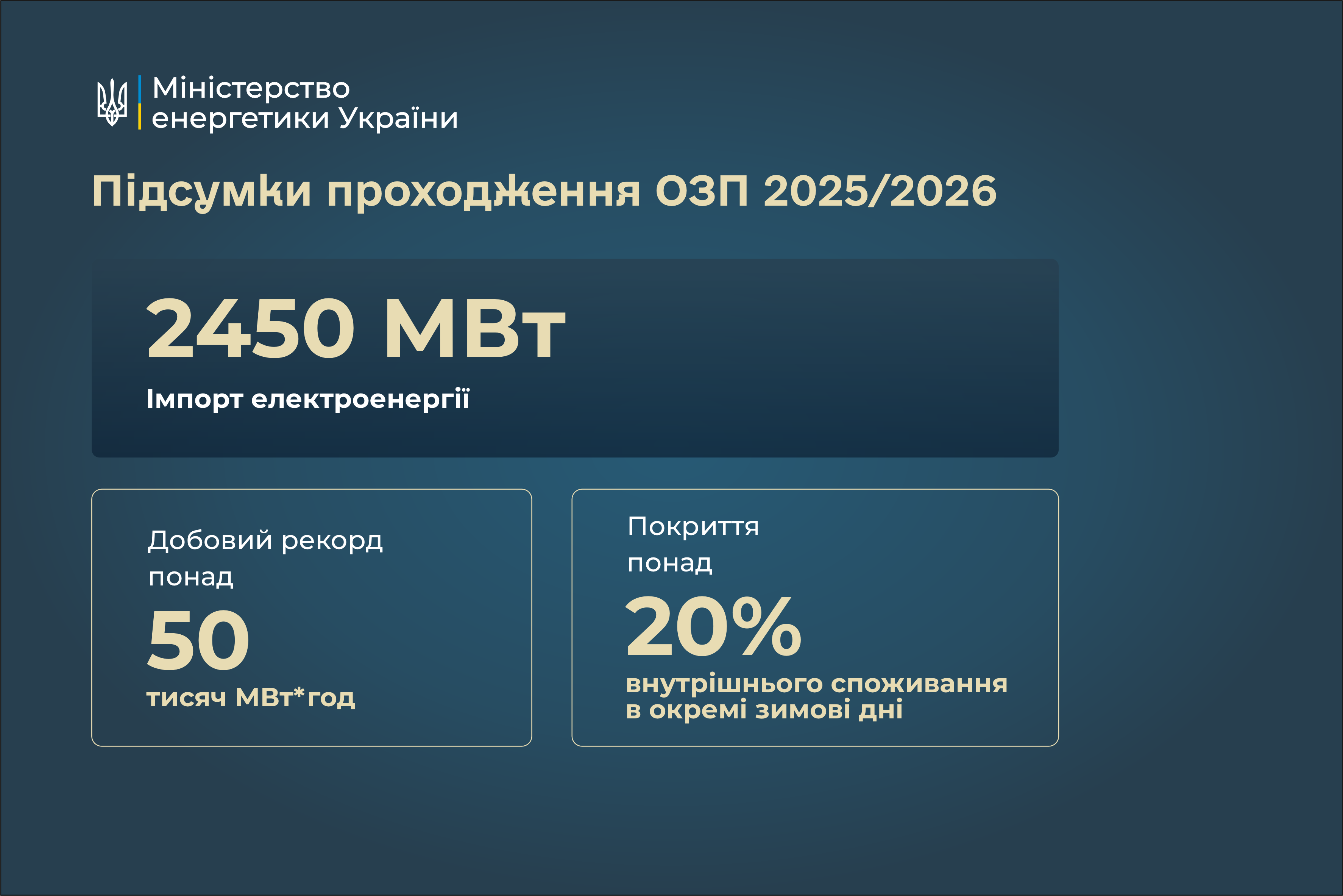 Збільшили можливість для імпорту електроенергії з ЄС. Максимальна потужність імпорту електроенергії була рекордною — 2450 МВт. Загалом в грудні-лютому імпортовано близько 3,6 млрд кВт·год електроенергії.