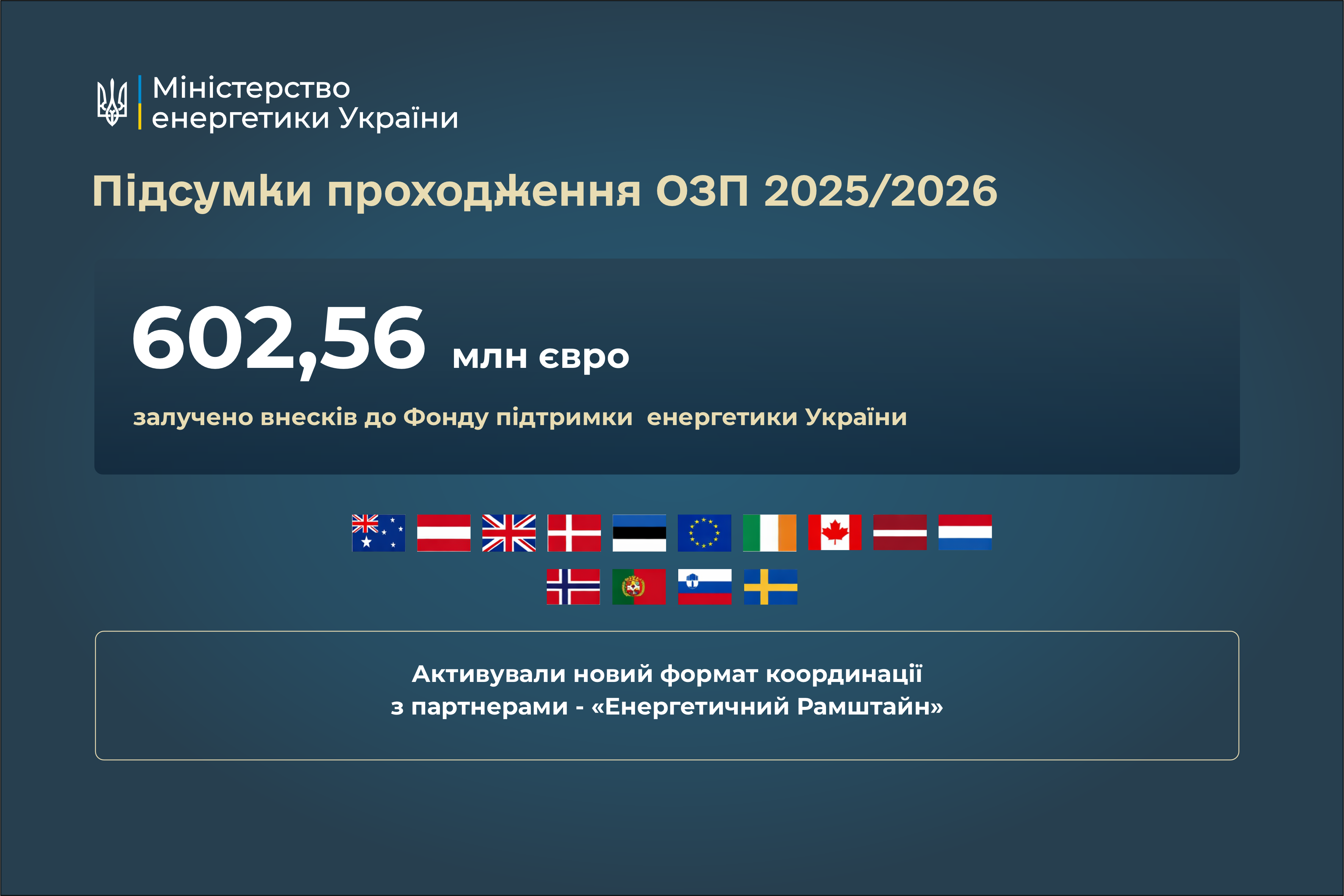 — Згуртовано коаліцію зимової енергетичної підтримки України, до якої долучилися понад 40 держав, що постачають генератори, трансформатори, когенераційні установки та інше обладнання.