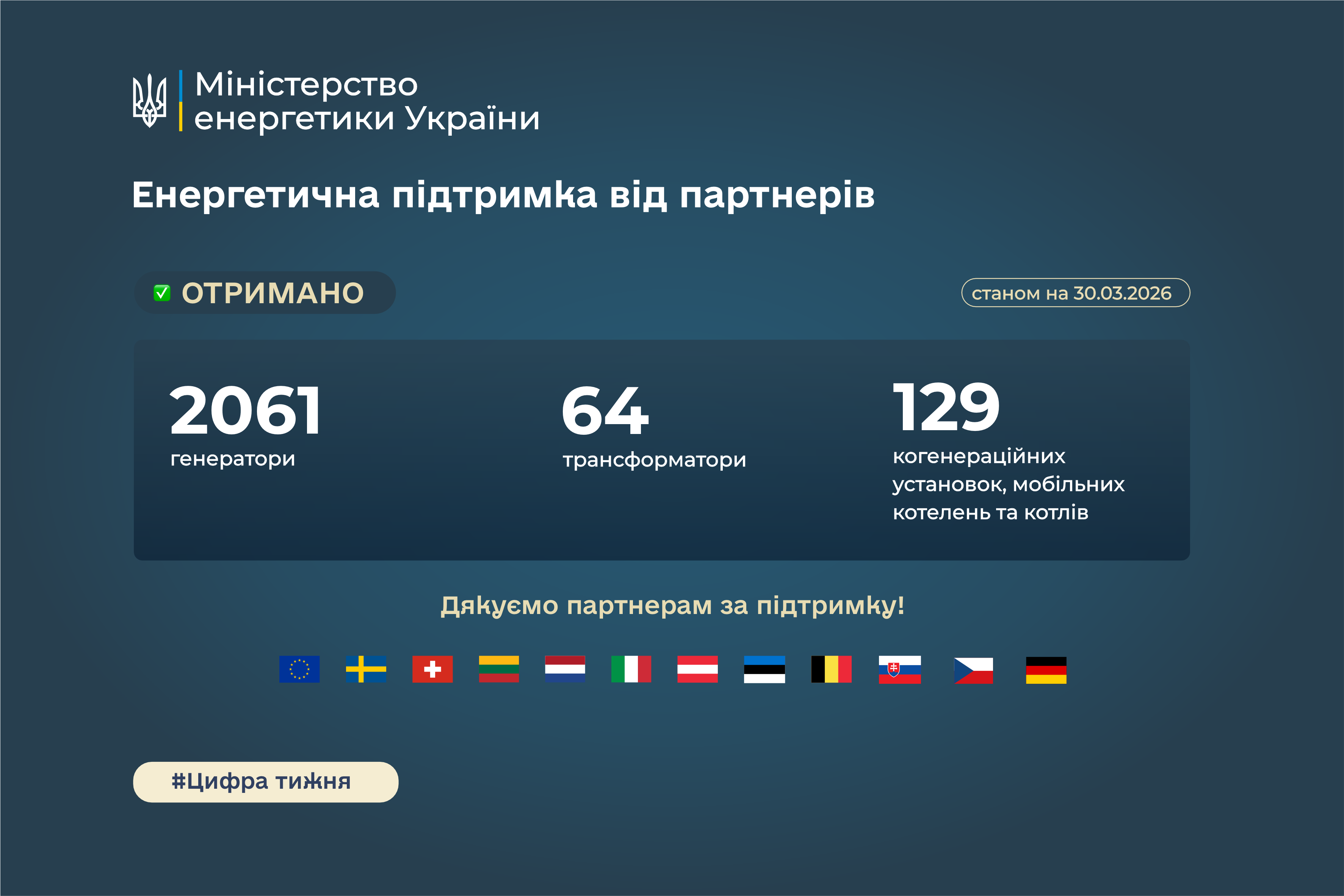 Загалом з березня 2022 року за координації Міненерго в Україну надійшло понад 27 тисяч тонн енергетичного обладнання. Із них понад 25 тисяч тонн вже розподілено між регіонами.