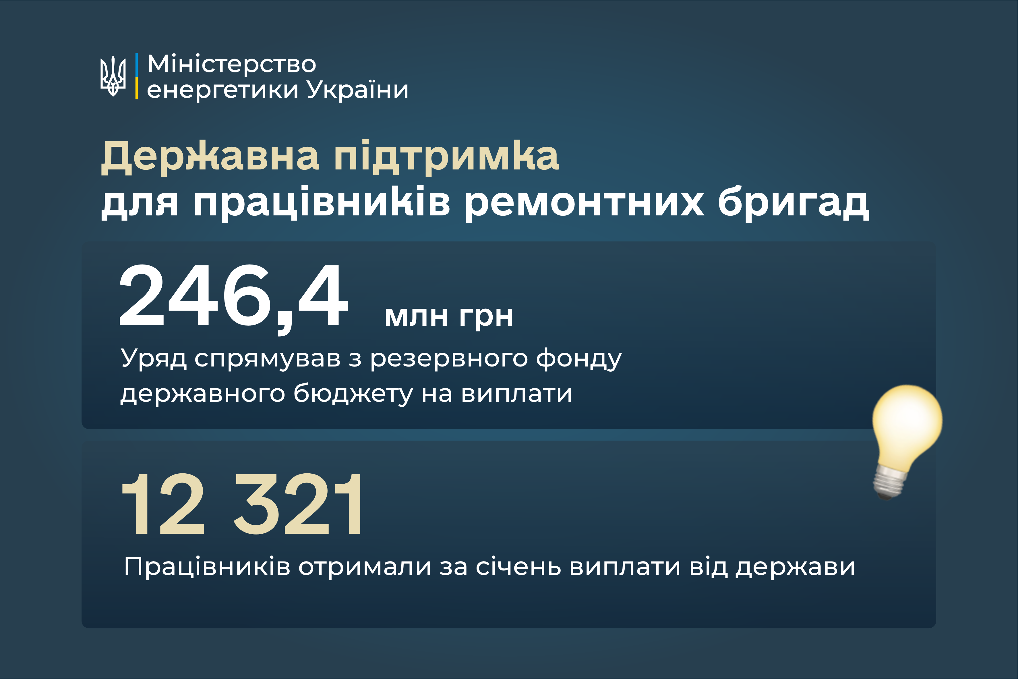 Усі вони працюють у надскладних умовах та в посиленому режимі, щоб повернути світло, воду й тепло в оселі українців. Для їхньої підтримки Уряд спрямував 246,4 млн грн з резервного фонду державного бюджету.