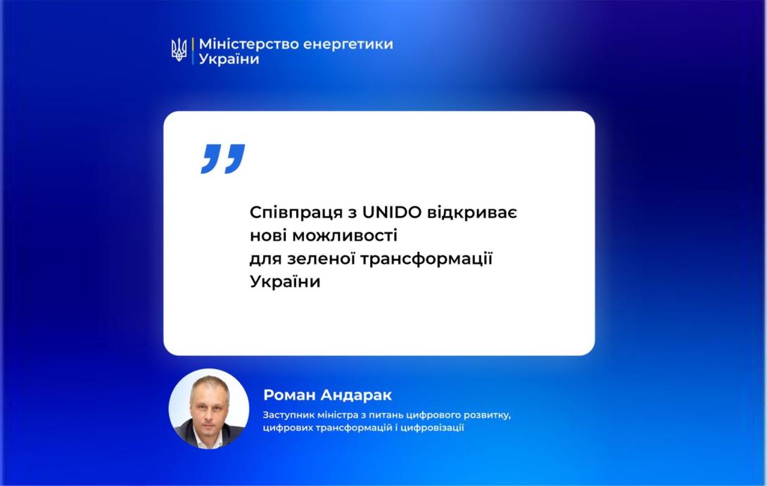 Роман Андарак відзначив важливість розвитку спільних пілотних проєктів та інвестицій у чисті технології, які сприятимуть енергетичній незалежності України та відновленню промисловості. «Я переконаний, що сьогоднішнє обговорення відкриє нові можливості для інвестицій, пілотних проєктів та технологічної співпраці між Україною, UNIDO та нашими міжнародними партнерами», – додав він.