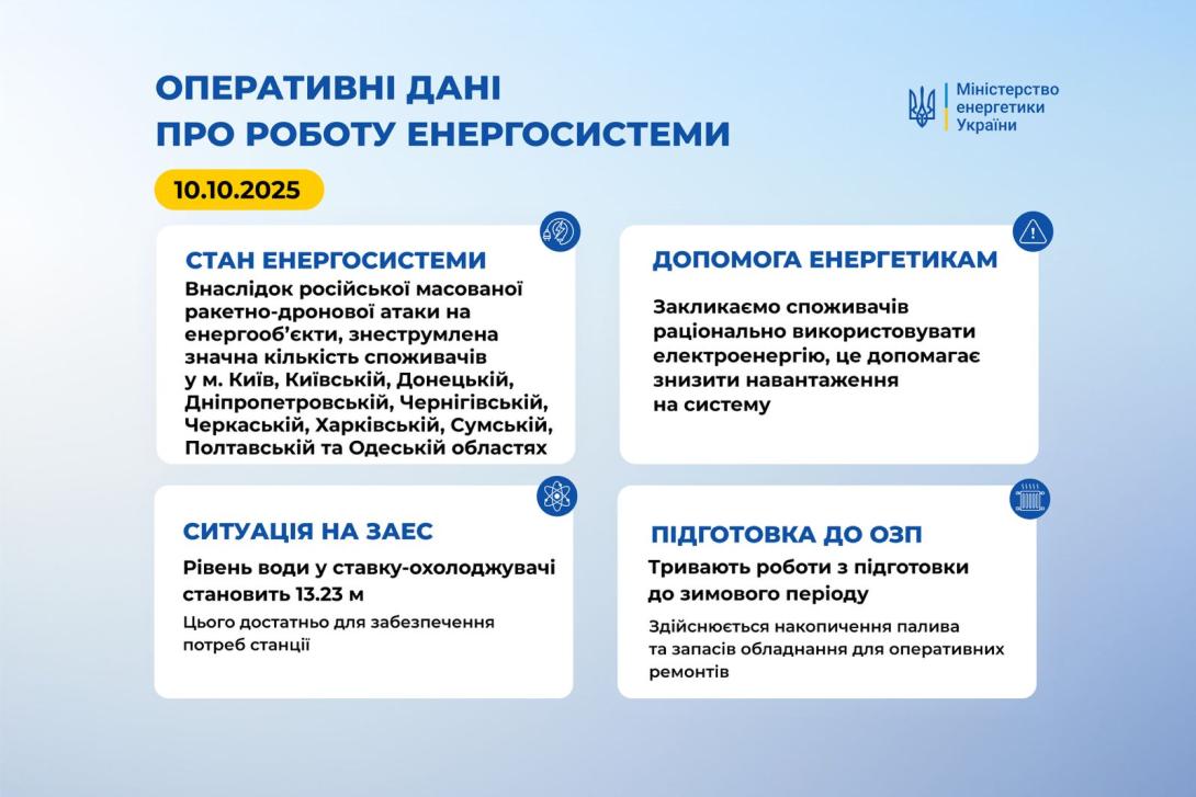 Внаслідок російської масованої ракетно-дронової атаки на енергообʼєкти, знеструмлена значна кількість споживачів у м. Київ, Київській, Донецькій, Дніпропетровській, Чернігівській, Черкаській, Харківській, Сумській, Полтавській та Одеській областях.