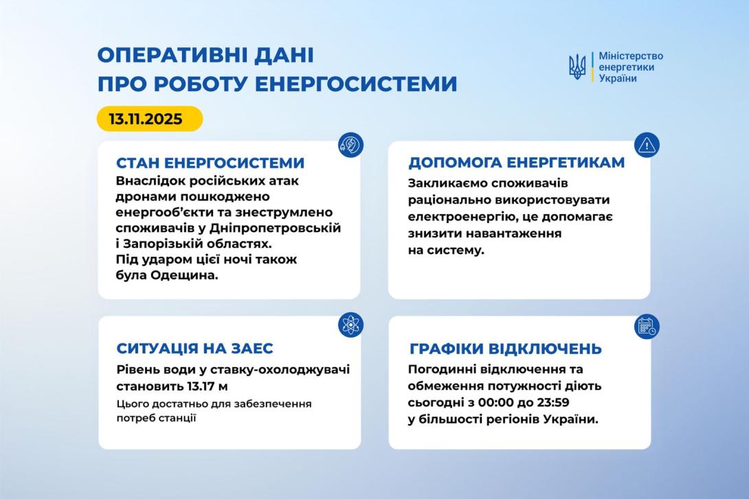 Внаслідок російських атак дронами на енергетичну інфраструктуру - на ранок зафіксовано пошкодження обладнання та знеструмлення споживачів Дніпропетровській і Запорізькій областях. Уночі під ударом також опинилися енергооб’єкти на Одещині. Енергетики оперативно виконують відновлювальні роботи на пошкоджених об’єктах.