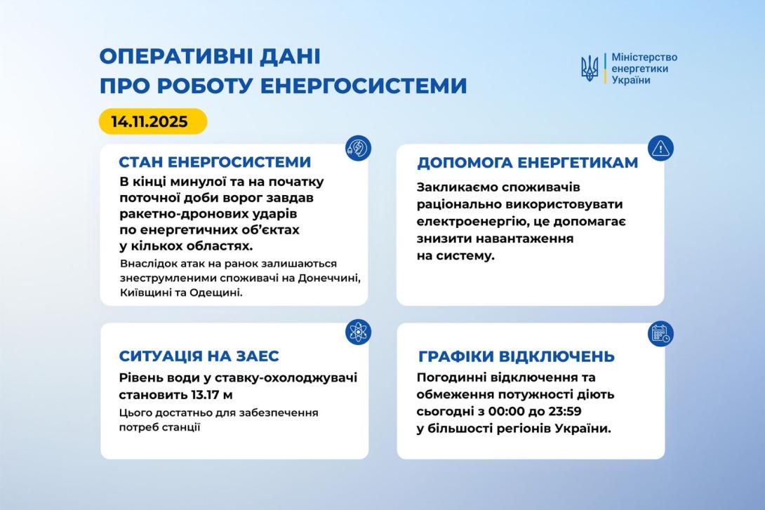 В кінці минулої та на початку поточної доби ворог завдав ракетно-дронових ударів по енергетичних об’єктах у кількох областях. Внаслідок атак на ранок залишаються знеструмленими споживачі на Донеччині, Київщині та Одещині. Енергетики оперативно виконують відновлювальні роботи на пошкоджених об’єктах.