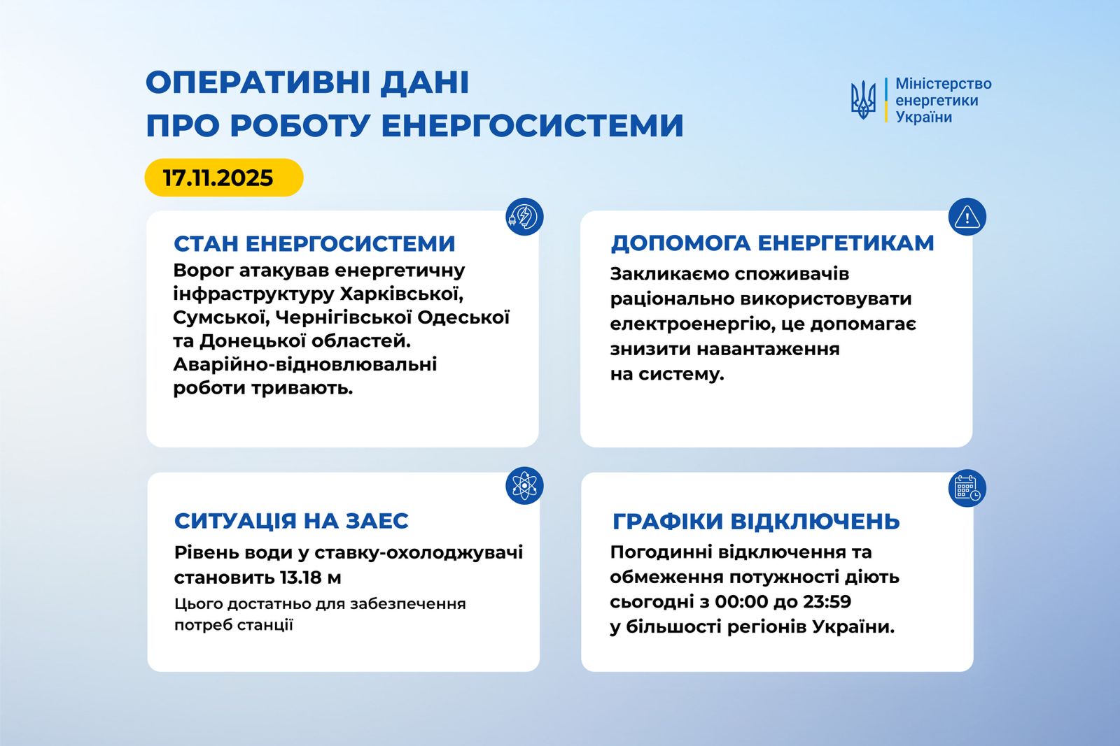 Ворог атакував енергетичну інфраструктуру Харківської, Сумської, Чернігівської Одеської та Донецької областей. На пошкоджених об’єктах енергетичної інфраструктури тривають ремонтно-відновлювальні роботи.