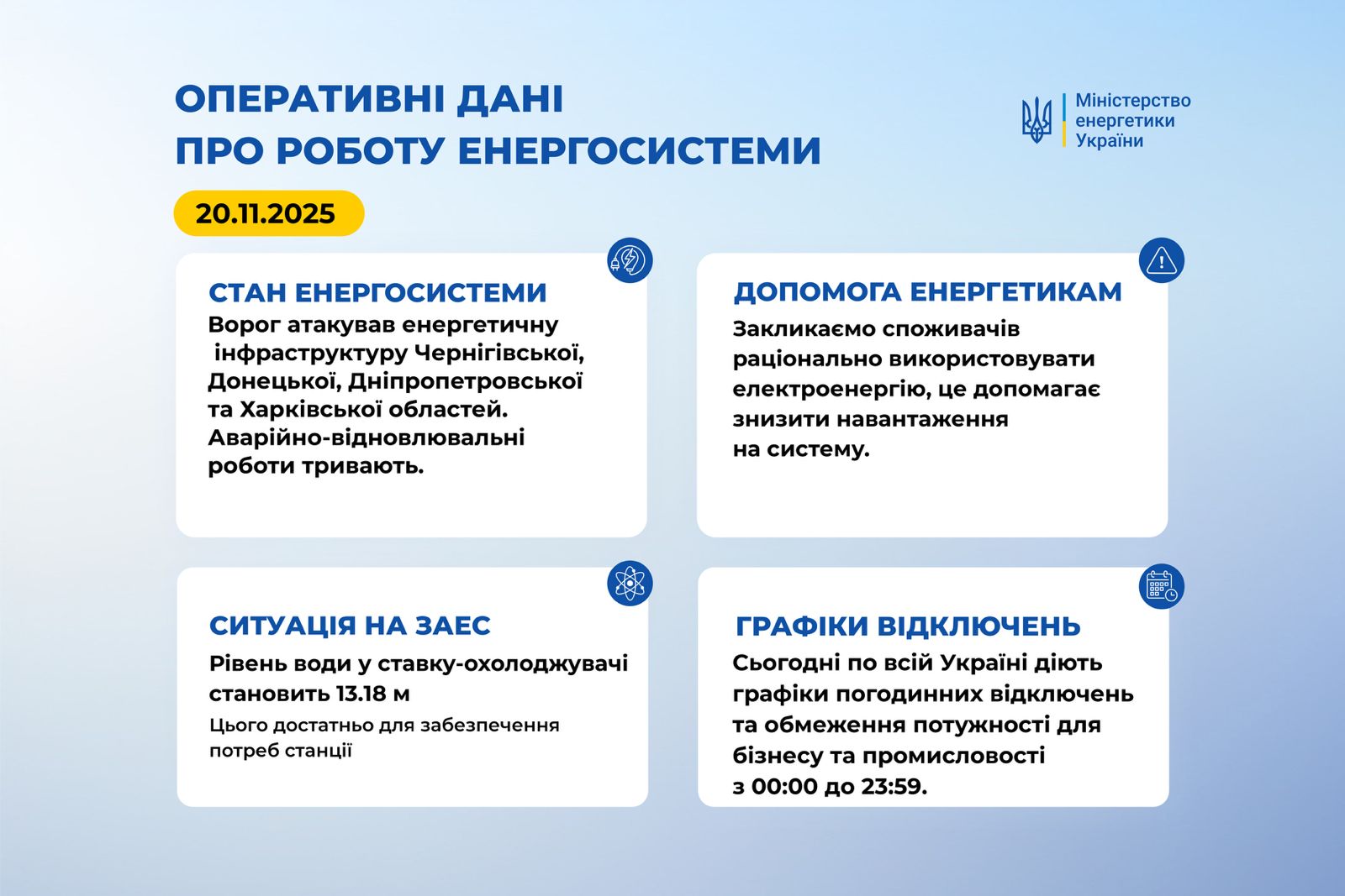 Ворог атакував енергетичну інфраструктуру Чернігівської, Донецької, Дніпропетровської та Харківської областей. На пошкоджених об’єктах енергетичної інфраструктури тривають ремонтно-відновлювальні роботи.