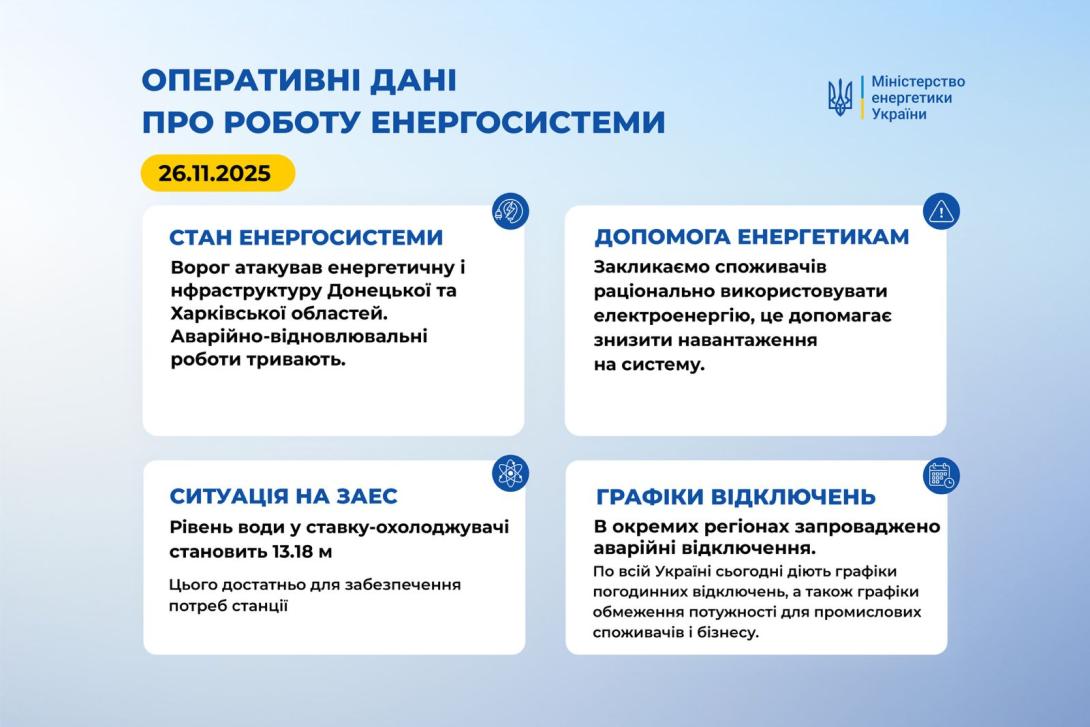 Для стабілізації ситуації в енергосистемі у Харківській, Сумській та Полтавській областях застосовані аварійні відключення. Сьогодні у всіх регіонах України з 00:00 до 23:59 застосовуються графіки погодинних відключень та графіки обмеження потужності для промислових споживачів та бізнесу.