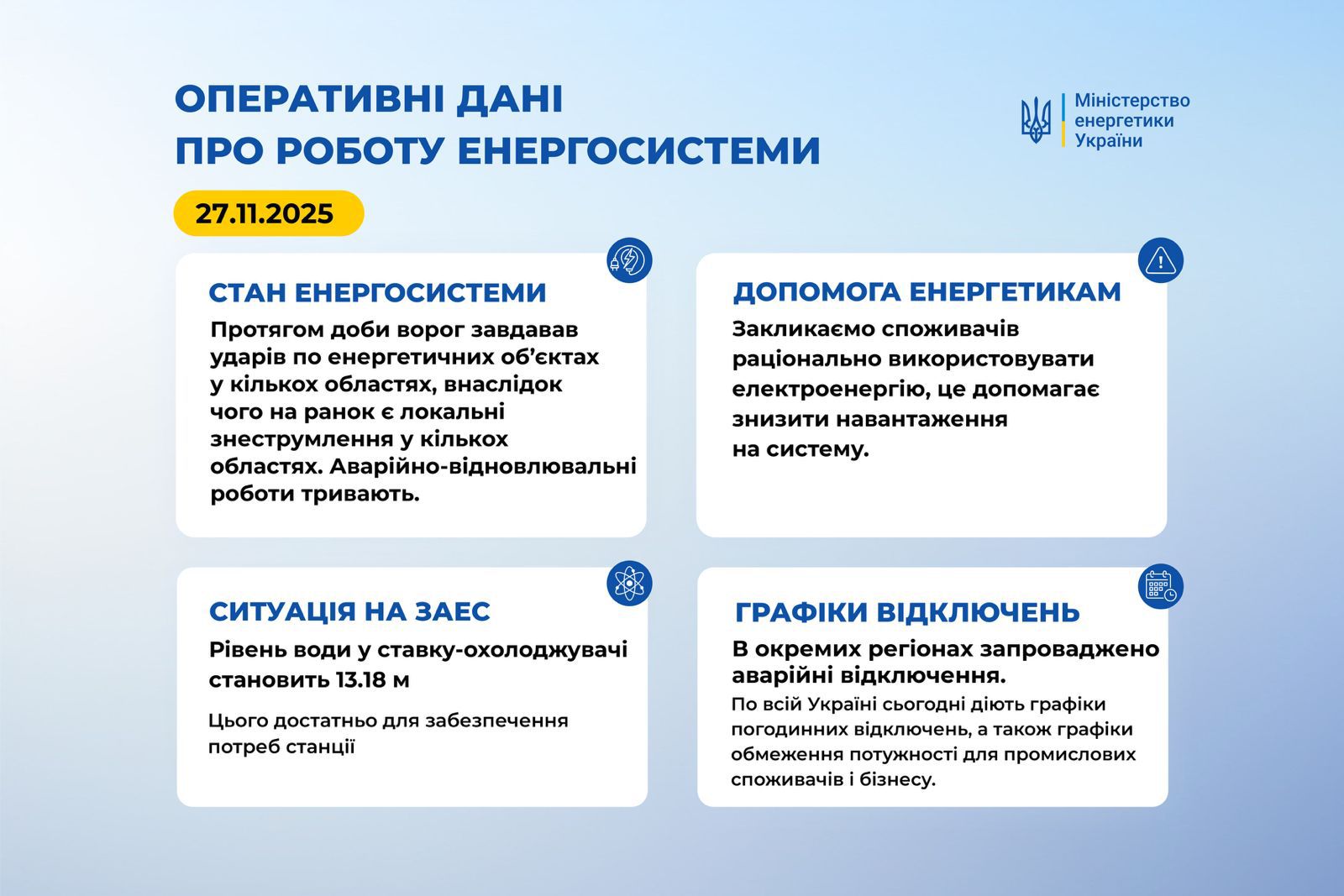 Протягом доби ворог завдавав ударів по енергетичних об’єктах у кількох областях, внаслідок чого на ранок є локальні знеструмлення у кількох областях. Аварійно-відновлювальні роботи тривають, енергетики працюють безперервно, щоб якнайшвидше відновити електропостачання.