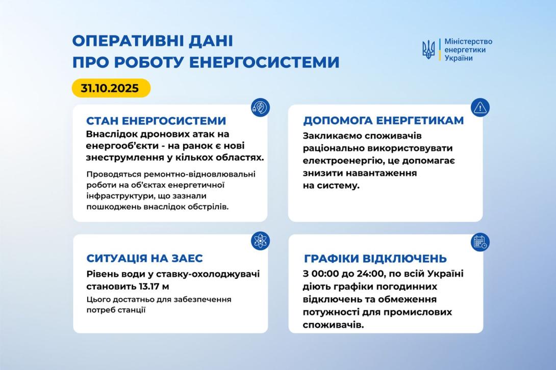 Внаслідок дронових атак на енергооб’єкти - на ранок є нові знеструмлення у кількох областях. Проводяться ремонтно-відновлювальні роботи на об’єктах енергетичної інфраструктури, що зазнали пошкоджень внаслідок обстрілів. Здійснюється комплекс заходів для забезпечення стабільного функціонування енергосистеми.