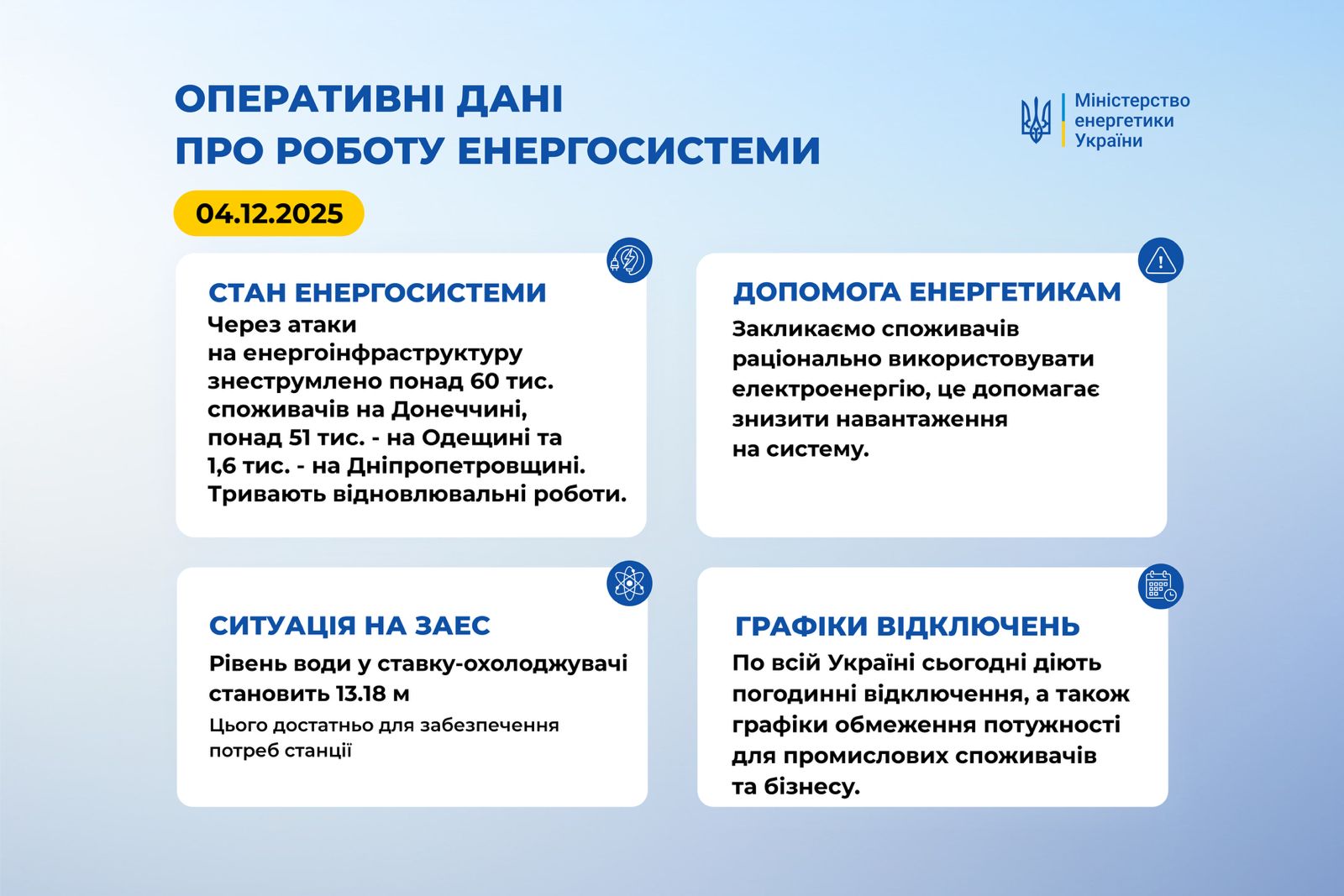 Внаслідок атак на енергетичну інфраструктуру станом на ранок знеструмлено понад 60 тисяч споживачів на Донеччині, понад 51 тисяча - в Одеській області, а також 1,6 тисячі споживачів на Дніпропетровщині. Аварійно-відновлювальні роботи тривають, енергетики працюють безперервно, щоб якнайшвидше відновити електропостачання.