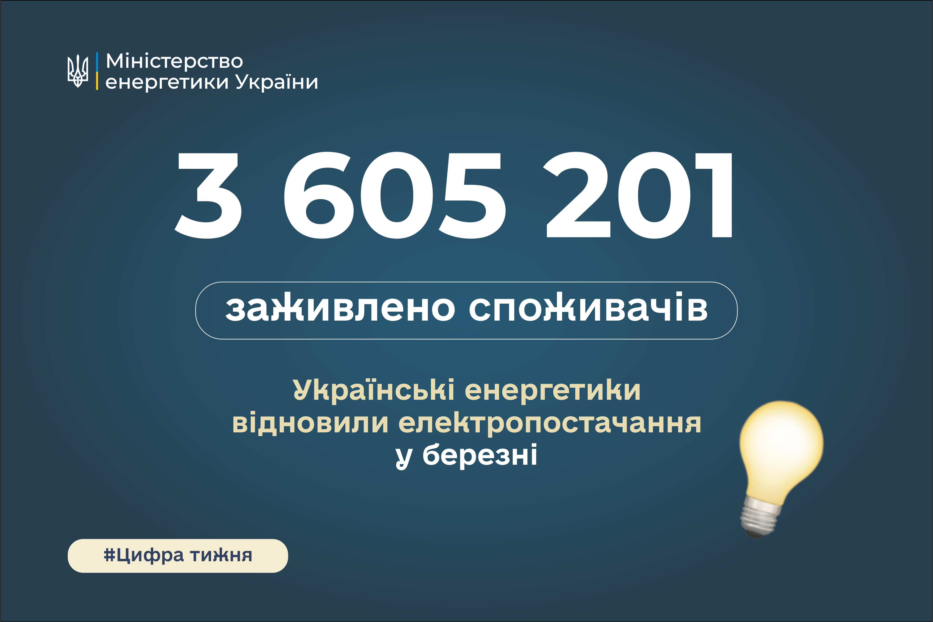 Упродовж березня українські енергетики відновили електропостачання для 3,6 млн споживачів, які були знеструмлені внаслідок російських атак та бойових дій.