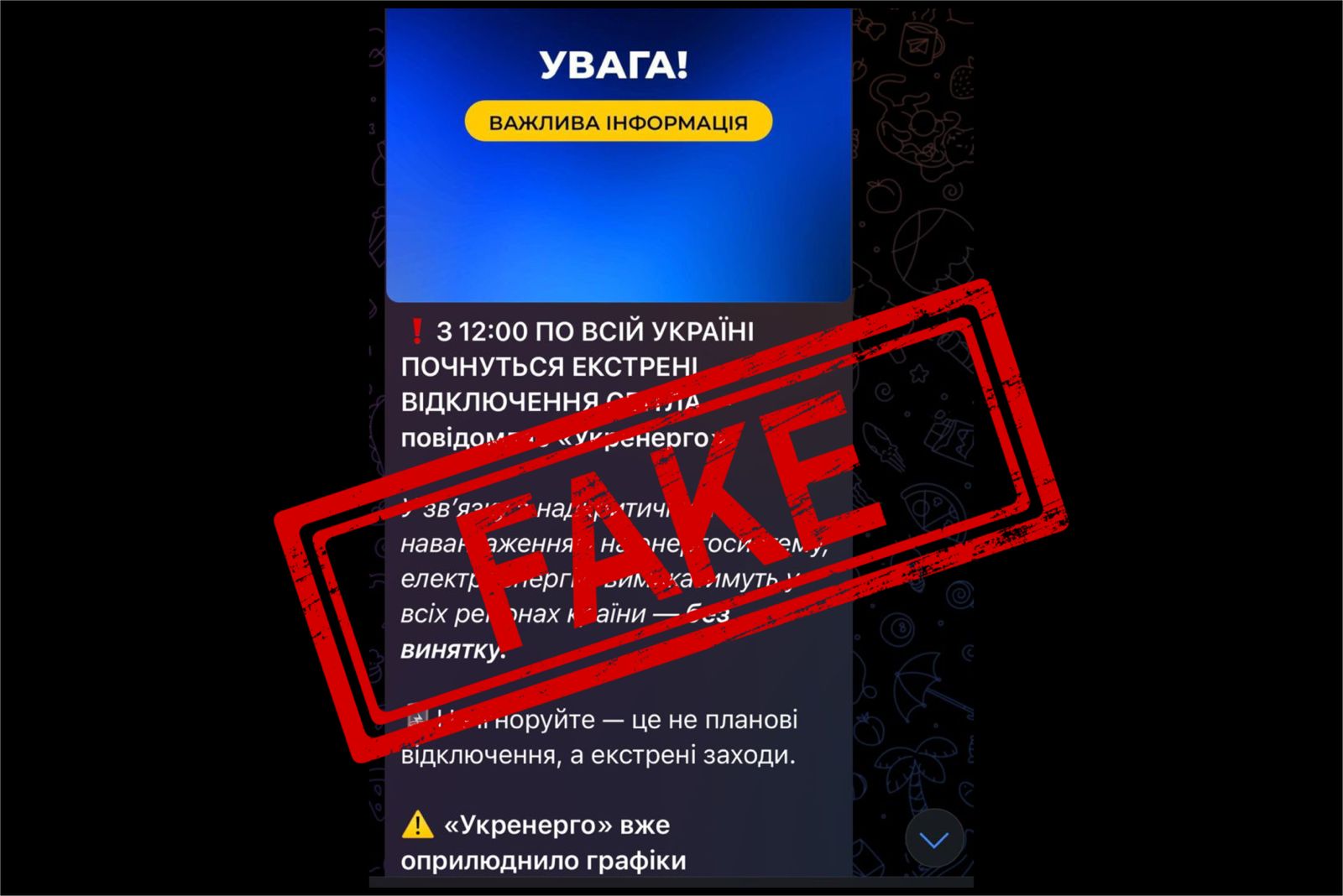 Якщо ви бачите повідомлення про відключення світла із закликом підписатися на невідомий Telegram-канал для отримання деталей – це ознака обману та, ймовірно, частина російської інформаційно-психологічної операції.
