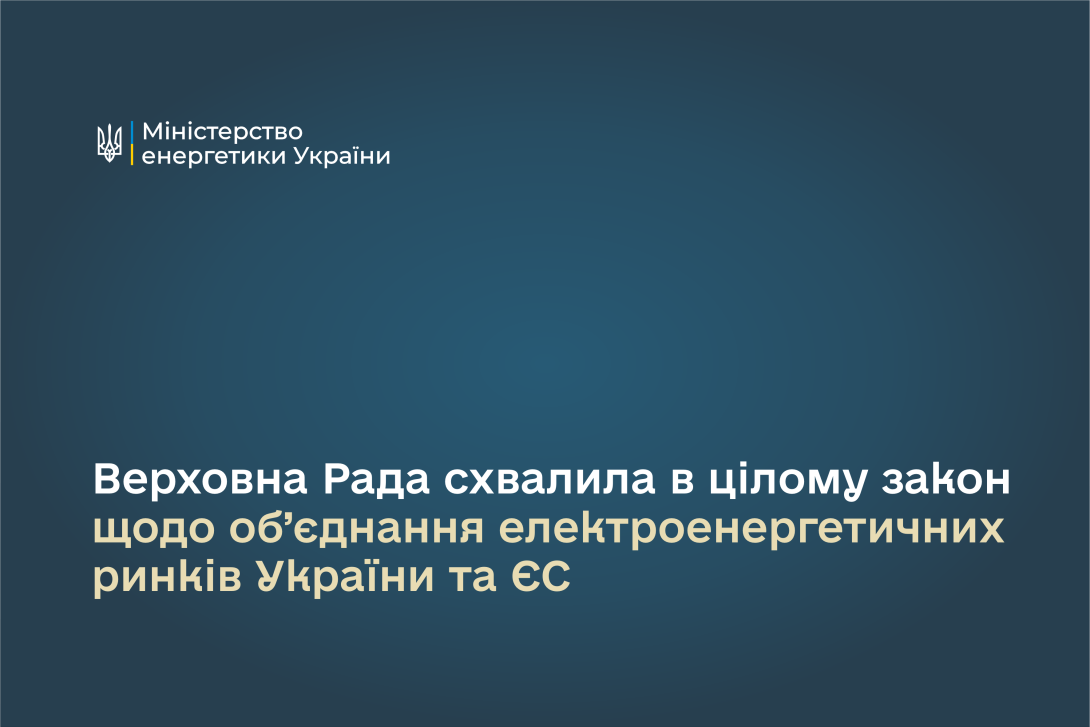 Верховна Рада України ухвалила в цілому доопрацьований законопроєкт №12087-д «Про внесення змін до деяких законів України щодо імплементації норм європейського права з інтеграції енергетичних ринків, підвищення безпеки постачання та конкурентоспроможності у сфері енергетики».