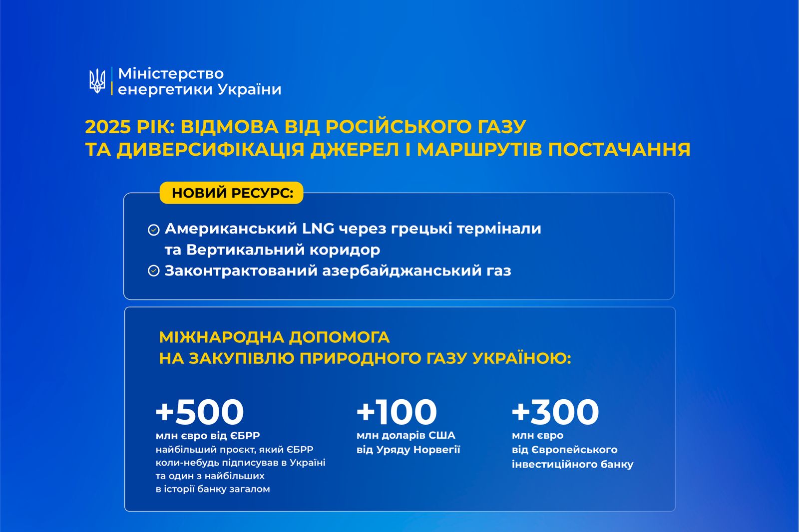 У 2025 році міжнародні партнери надали Україні значну фінансову підтримку для закупівлі природного газу, зокрема, ЄБРР надав відновлюваний кредит на 500 млн євро під гарантію ЄС, уряд Норвегії виділив майже 100 млн доларів США, а Європейський інвестиційний банк надав 300 млн євро для формування стратегічних запасів газу напередодні опалювального сезону.