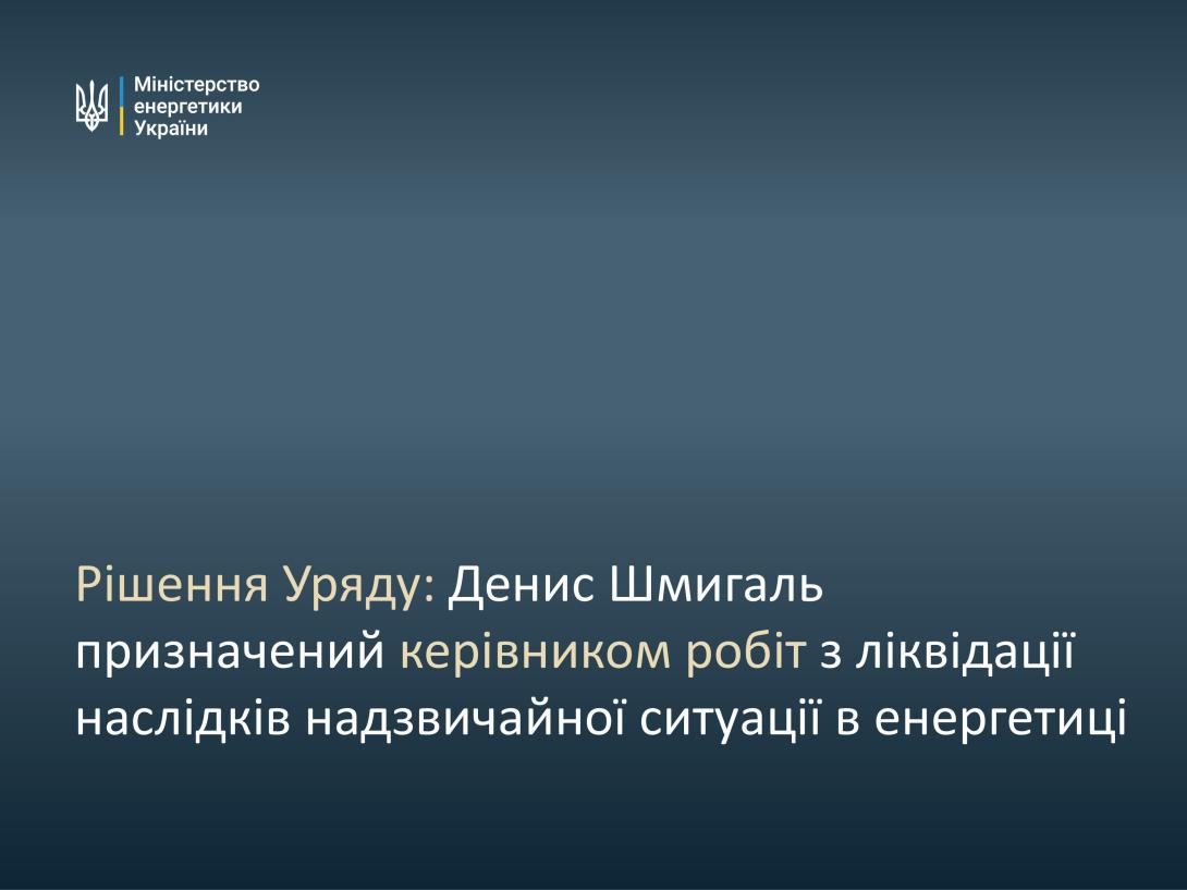 У зв’язку із масованими атаками російської федерації в українській енергетиці наразі діє режим надзвичайної ситуації. Рішенням Уряду на Першого віцепрем’єр-міністра - Міністра енергетики Дениса Шмигаля покладені повноваження керівника робіт з ліквідації її наслідків.