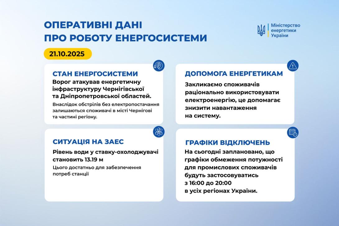 Ворог атакував енергетичну інфраструктуру Чернігівської та Дніпропетровської областей. Внаслідок обстрілів без електропостачання залишаються споживачі в місті Чернігові та частині регіону. Виконанню аварійно-відновлювальних робіт заважає повітряна тривога через російські ударні БПЛА, відновлення споживачів розпочнеться як тільки дозволить безпекова ситуація.
