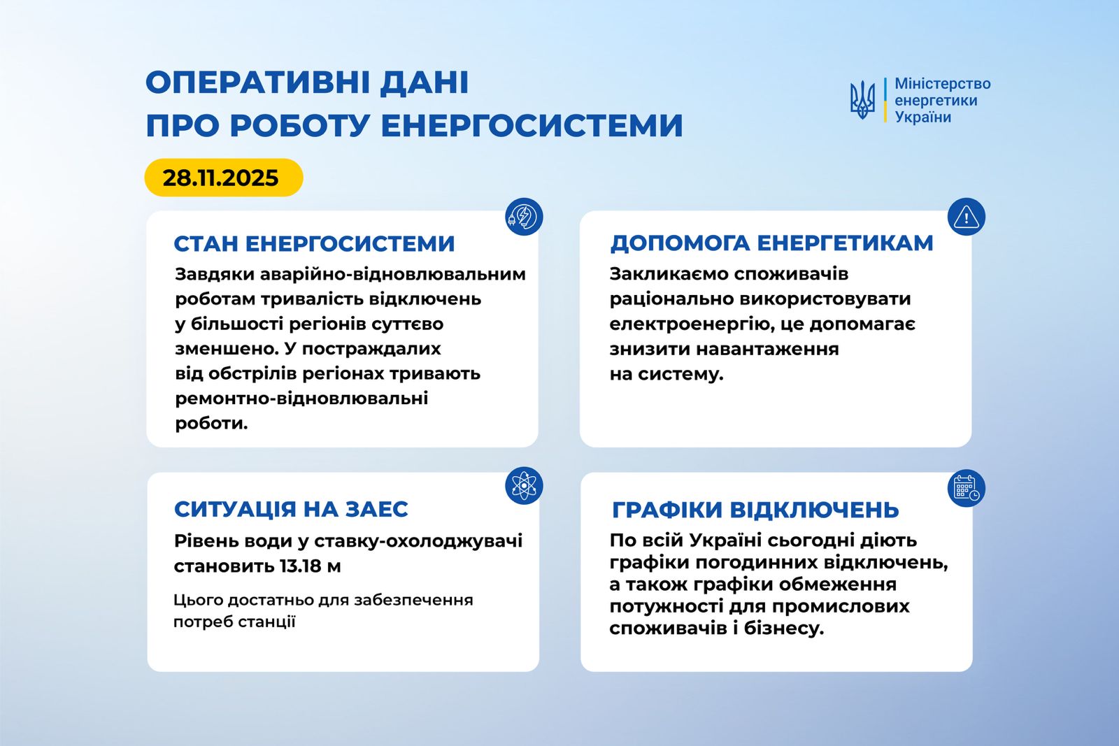 Закликаємо споживачів раціонально використовувати електроенергію протягом усього дня, особливо у пікові години споживання вранці і ввечері. Це допомагає знизити навантаження на систему.