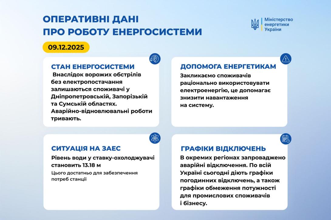 Внаслідок ворожих обстрілів по енергетичній інфраструктурі на ранок без електропостачання залишаються споживачі у Дніпропетровській, Запорізькій та Сумській областях. Аварійно-відновлювальні роботи тривають, енергетики працюють безперервно, щоб якнайшвидше відновити електропостачання.